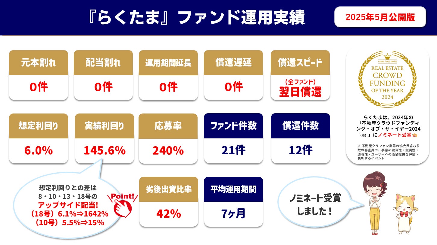 『らくたま』において、本日2025年6月4日に早期償還を実施した3つのファンドにつきまして、今回の早期償還に至った理由および事業者としての判断背景についてご説明申し上げます。