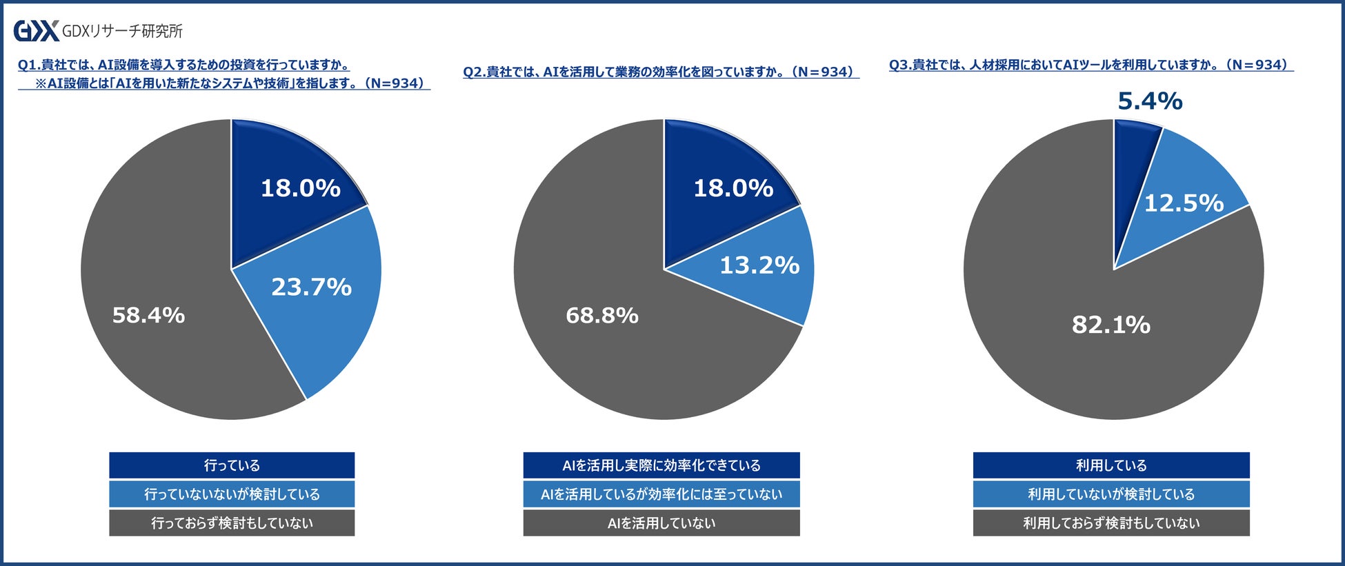 Q1,2の結果から、AIに対し、投資をできていない、そもそも使っていないという企業が大半でありつつも、活用できている企業は効率化の効果を感じていると分かります。