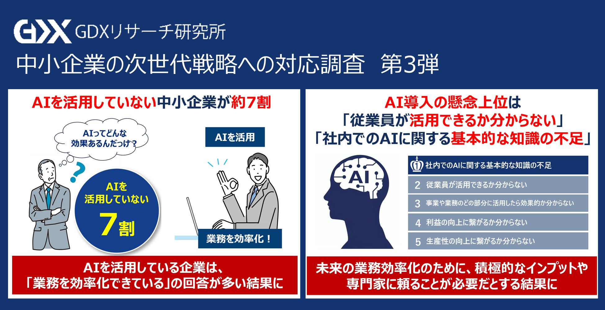 本調査の結果では、中小企業の約7割がAIを活用していない、できていないという状況でした。