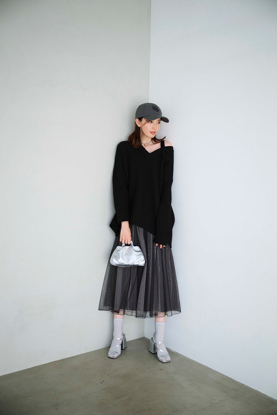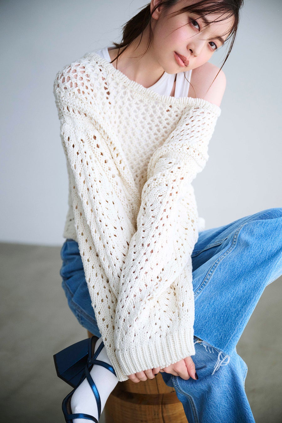 前後2way仕様のレーシーニットにスポーティータンク&デニムを合わせた春の定番デニムコーデが完成