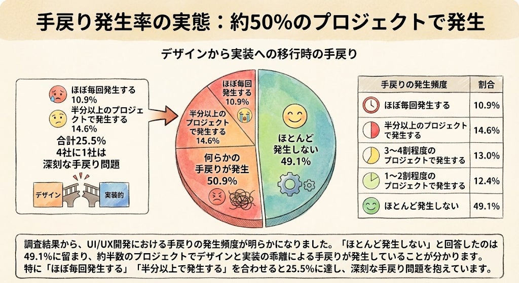 その結果、約50%のプロジェクトでデザインから実装への移行時に手戻りが発生しており、その解決策としてバイブコーディング(AI駆動によるUI開発手法)への関心が50.8%に達していることが明らかになりました。