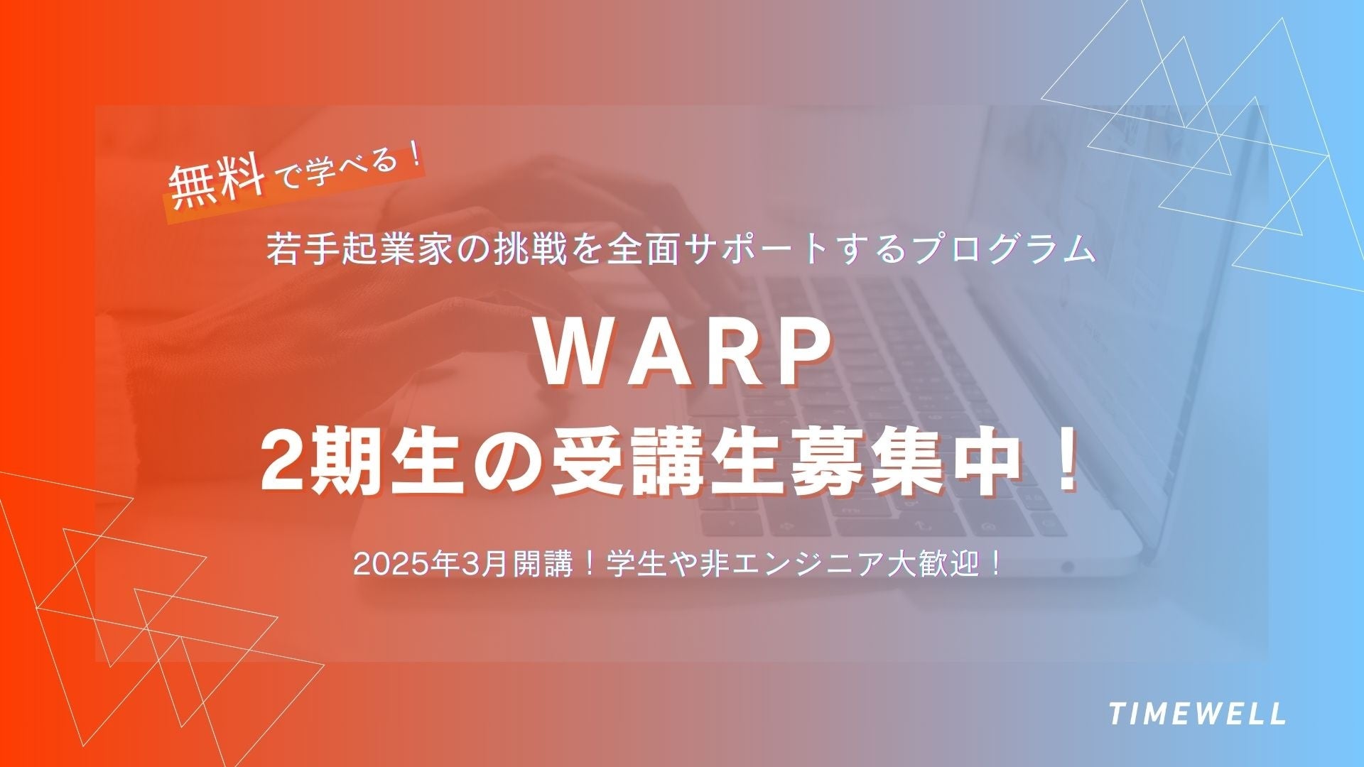 WARPは、自ら開発できる若手テクニカルアントレプレナー育成プログラムです。東京都の多様な主体によるスタートアップ支援展開事業「TOKYO SUTEAM」の協定事業者として、事業開発・アプリ開発講座を無料で提供しております。また、登記や実証実験まで、一部費用も含めてサポートいたします。