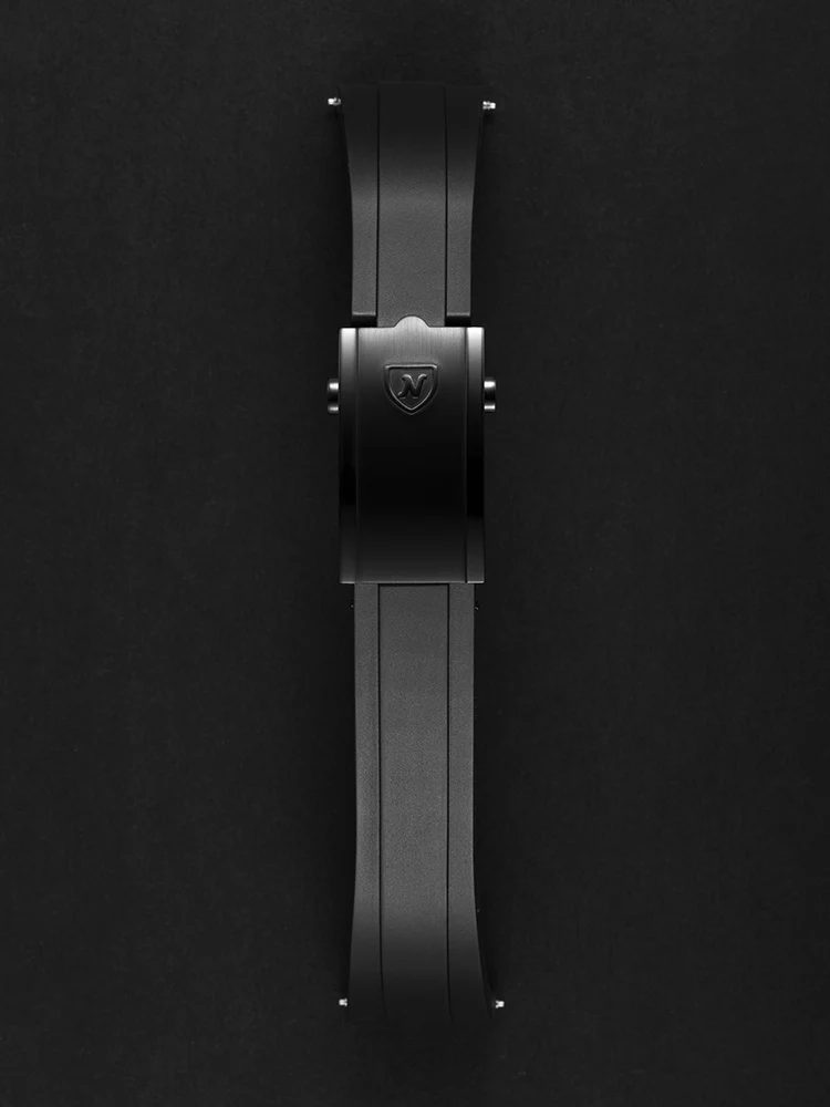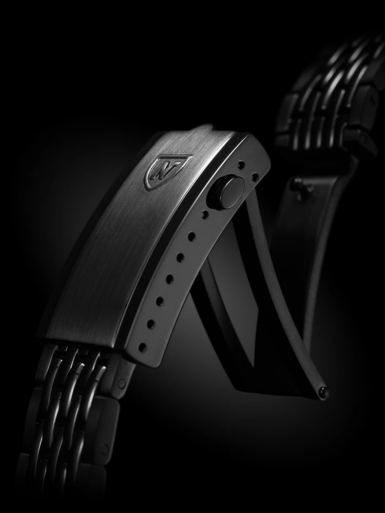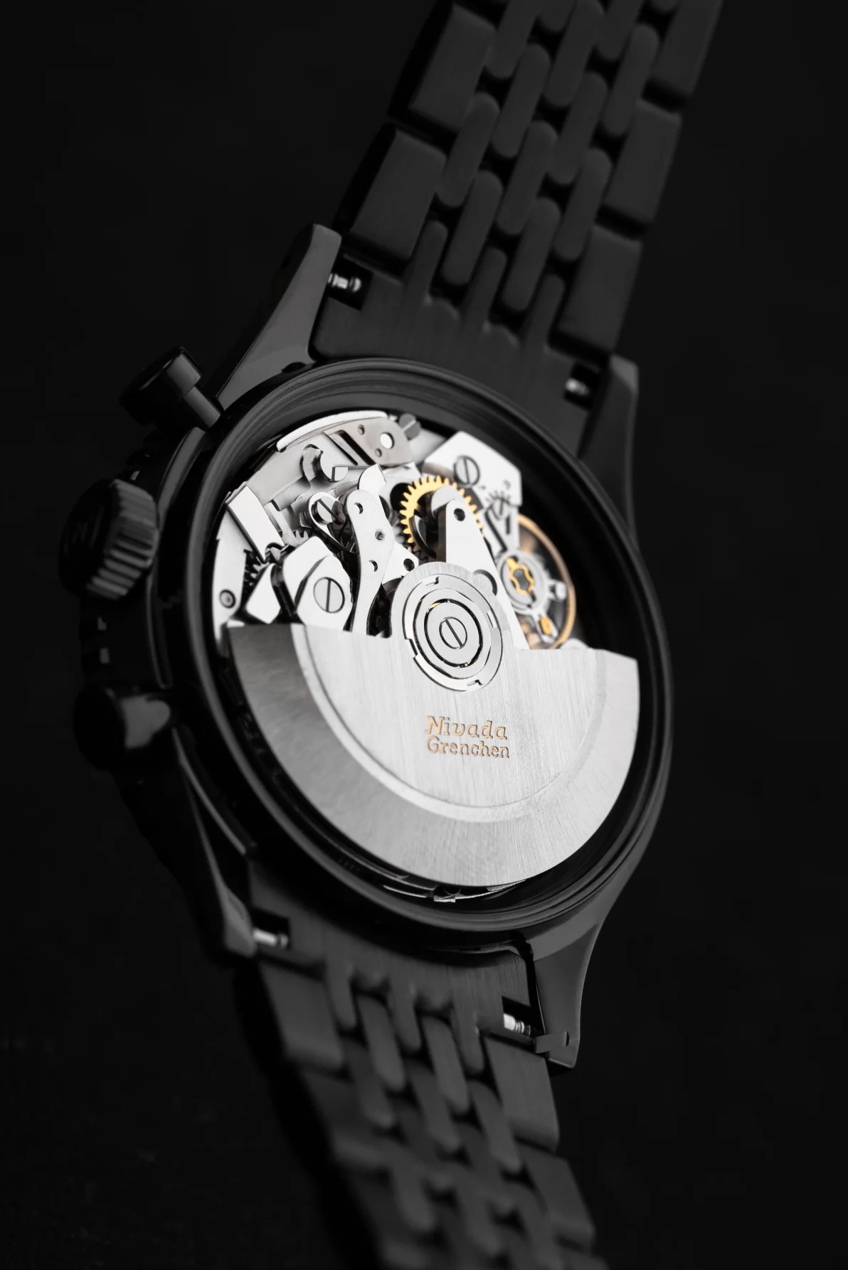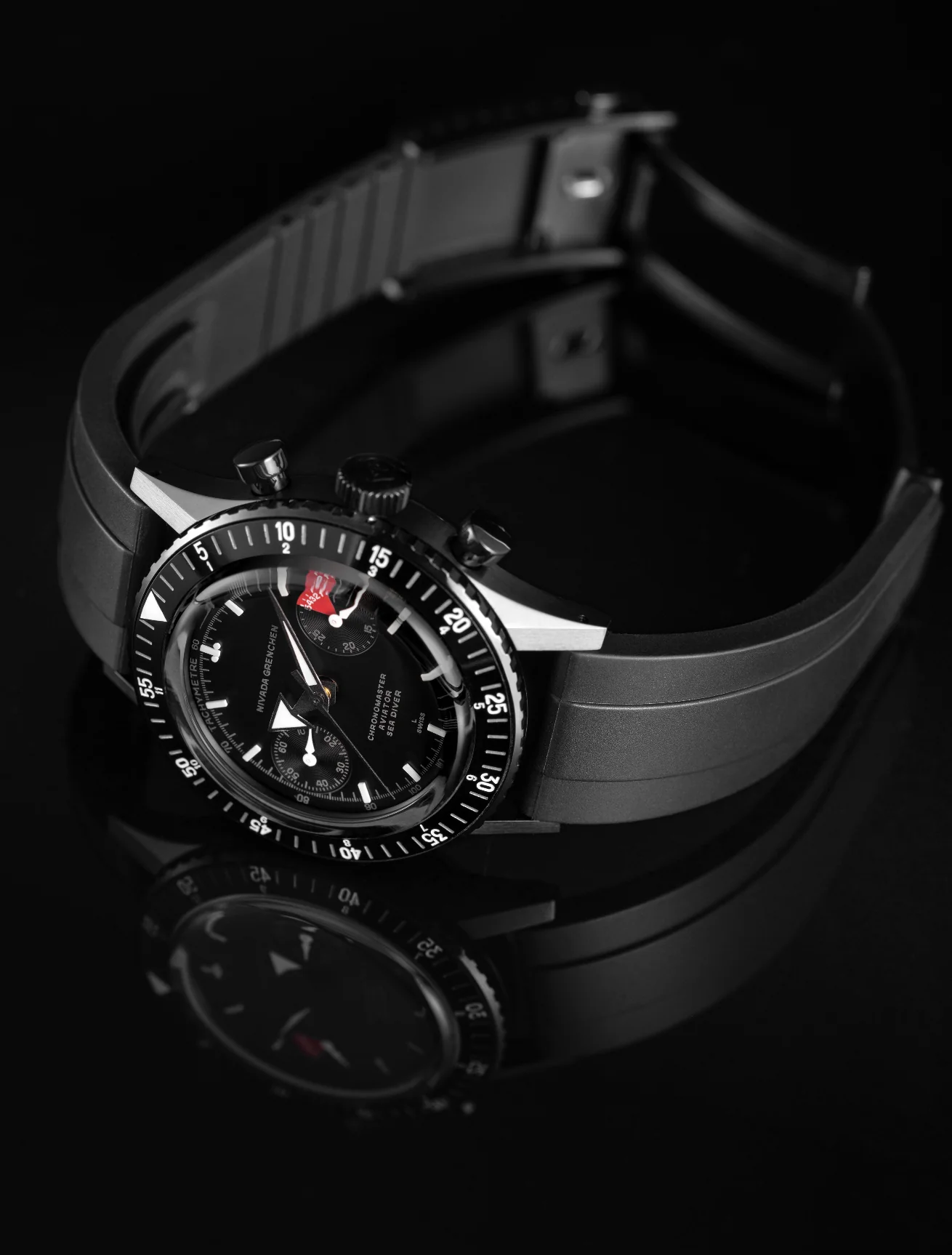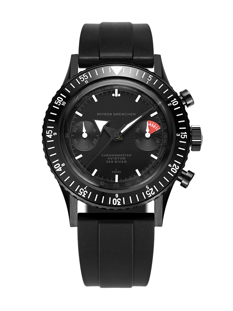 光沢のあるブラックDLCコーティングを施したケースに、マットブラックのダイヤルを組み合わせ、ホワイトのルミノバインデックスが優れた視認性を確保。さらに、3時位置には鮮やかなレッドの「ヨットカウンター」機能を搭載し、Nivadaの探検精神を象徴する大胆なアクセントとなっている。