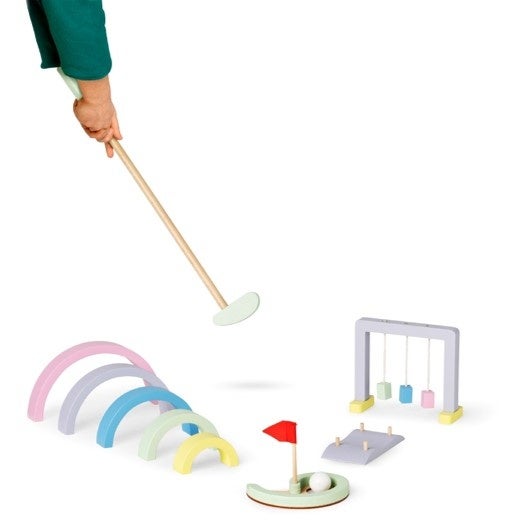 パステルカラーがキュートな木製ゴルフセット!ただホールインして楽しむだけでなく、虹の中を駆け抜けたり、障害物を乗り越えたり、色々な楽しみ方ができます◎