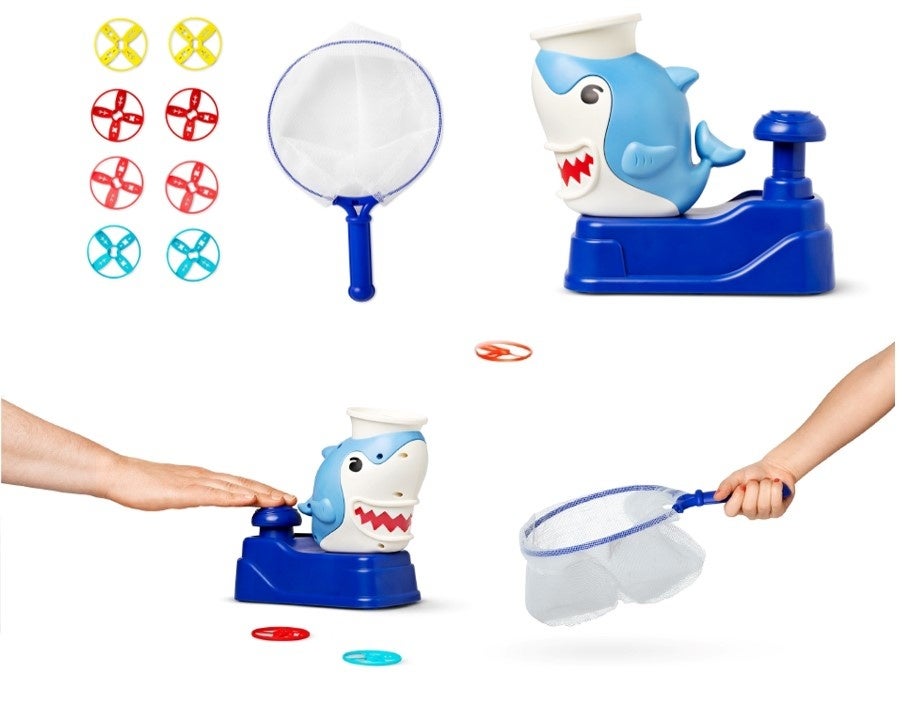 サメの頭からフライングディスクを発射!付属の網を使って捕まえる!どこへ飛ぶか分からないから面白い、シンプルでエキサイティング!何個取れるか競い合おう。