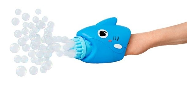 手がサメになっちゃった?!本体の中にある秘密のボタンを押すと大量のシャボン玉が!付属のトレーに液を入れてつけるだけの簡単タイプ