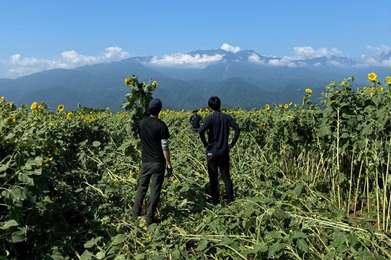 平成4年から始まった北杜市明野サンフラワーフェスはこれまで、広大な畑の耕耘やひまわりの定植、除草作業などの管理を、地域の人が中心となって行ってきました。しかし近年、地域住民の高齢化や人手不足が深刻化し、美しいひまわり畑の維持が課題となっています。昨年のイベント期間中には、豪雨や強風の影響によって開花し始めたひまわりが倒れ、お客様を迎えられない状況となりました。そんな中、有志わずか15人ほどで、広大な面積の倒れたひまわりを1本1本起こす作業を行い、無事お客様を迎え入れることができました。