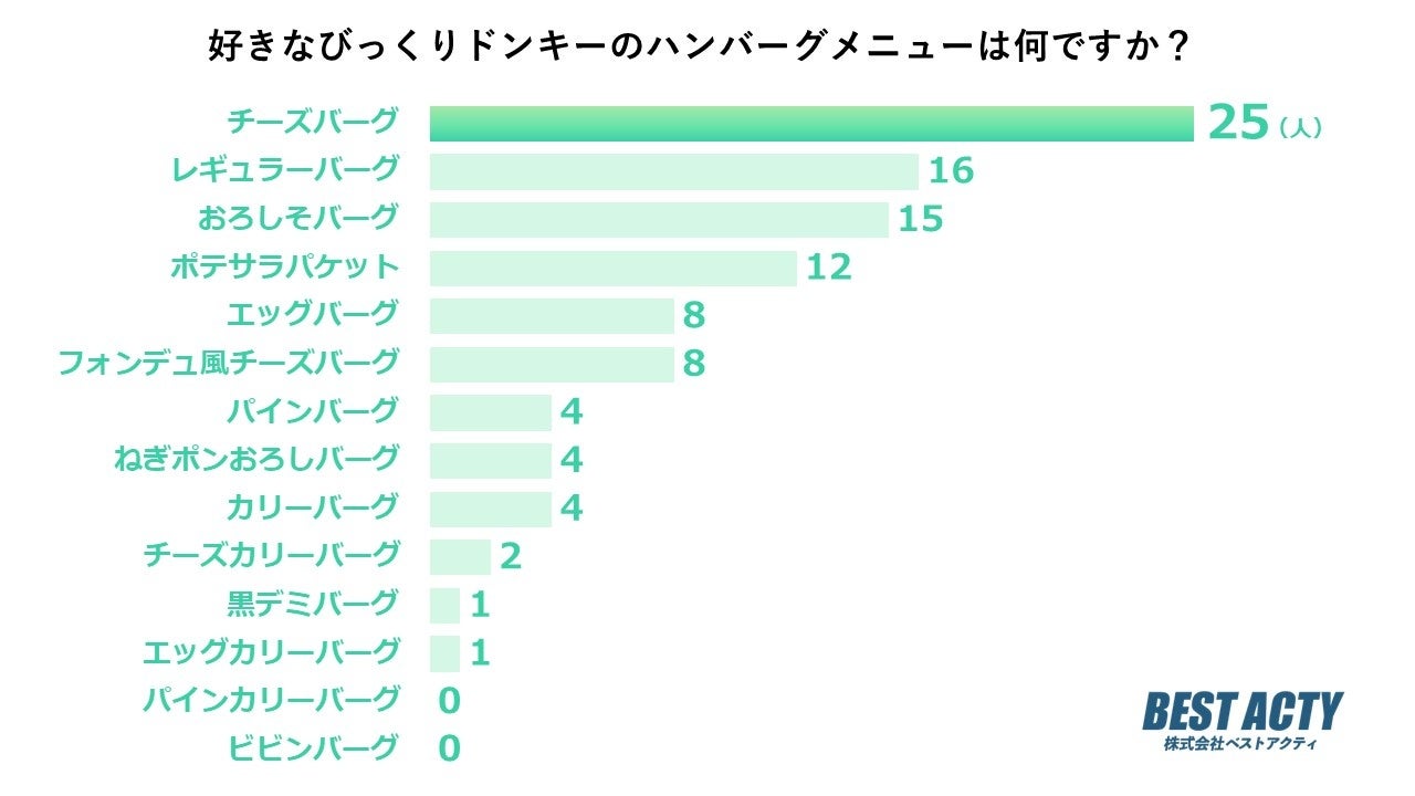 好きなびっくりドンキーのハンバーグメニューについて100人にアンケートを行ったところ、「チーズバーグ」と回答する人が最も多い結果となりました。