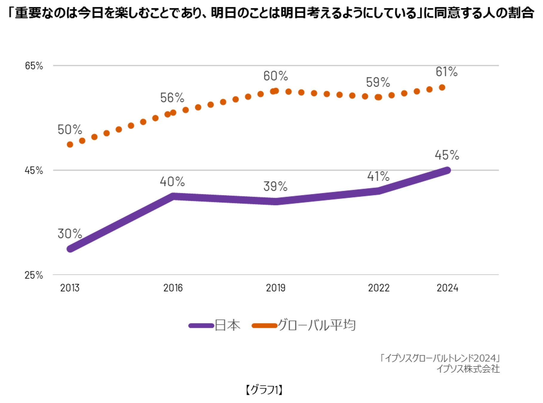 世界最大規模の世論調査会社イプソス株式会社(日本オフィス所在地:東京都港区、代表取締役:内田俊一)は、日本を含む世界50市場50,237人を対象に、世界がどのように変化しているかを包括的に把握する「グローバルトレンド2024」を発表しました。同レポートの政治に関連するトピック(ヌーヴォー・ニヒリズム)において、日本では「今を生きる」刹那主義の価値観を持つ人が、この10年間で15ポイント上昇し、約1.5倍に増加していることがわかりました。