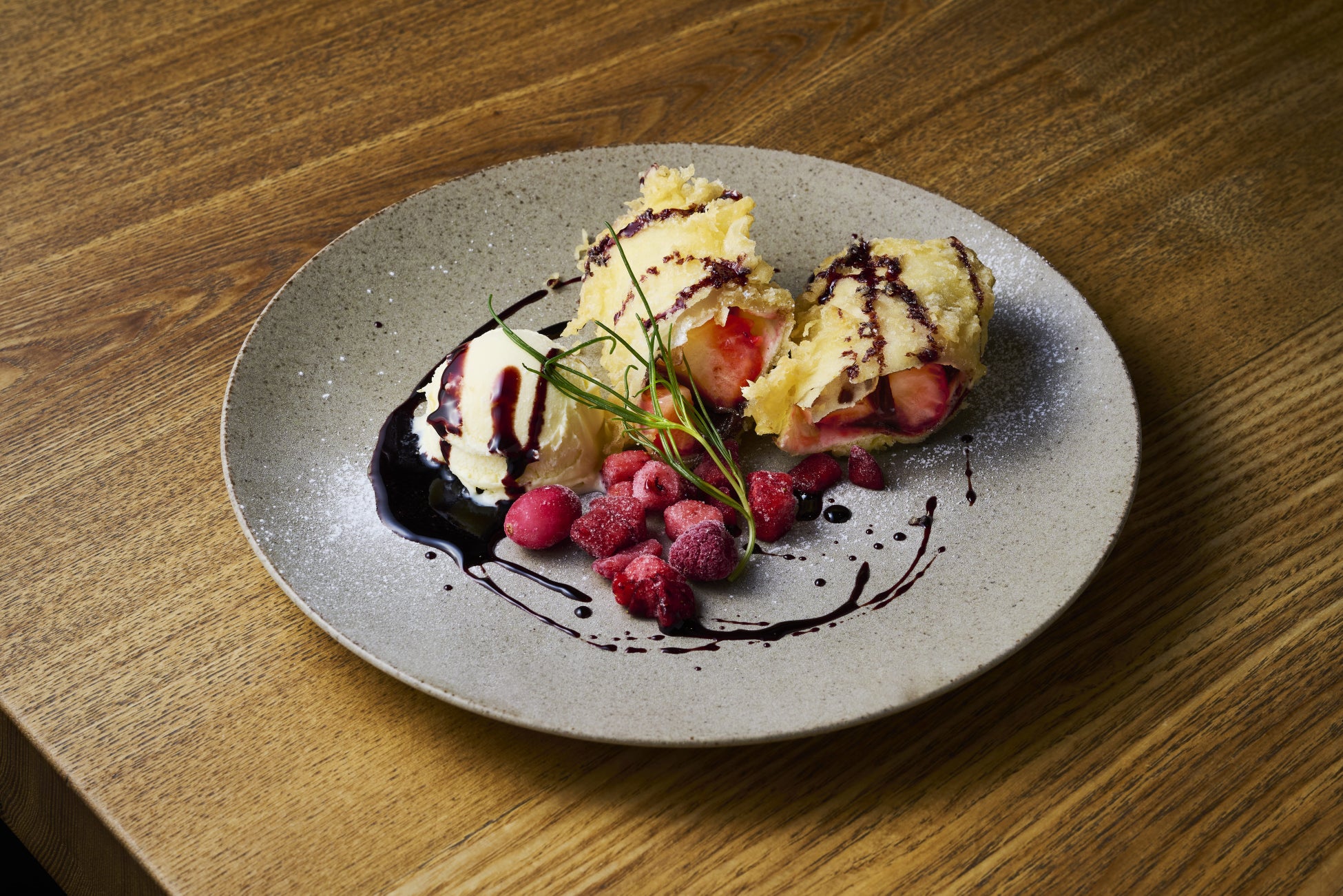 いちごとチョコレートを春巻き天ぷらに。バニラアイスを添えた天ぷら専門店ならではのいちごのスイーツです。