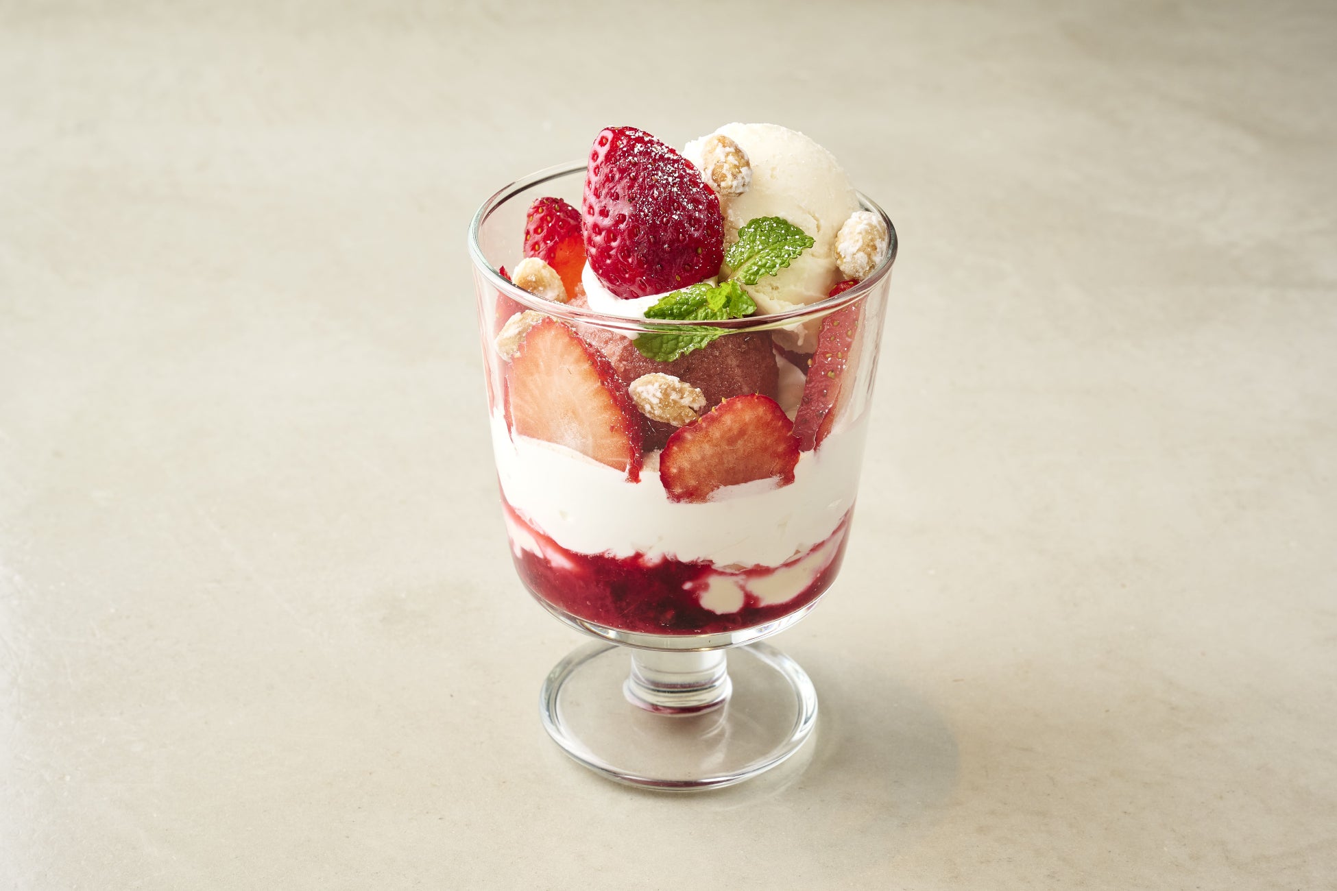 甘酸っぱいいちごやラズベリーに、濃厚なマスカルポーネアイスを合わせたパフェ。