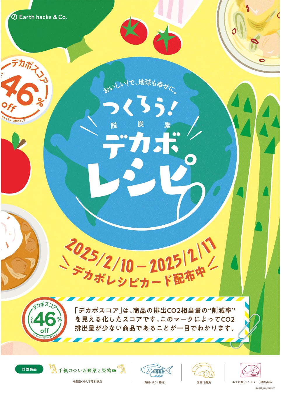 生活者の声をもとに、脱炭素関連商品・サービスや事業の開発を目指す生活者共創型プラットフォームを展開するEarth hacks株式会社(本社:東京都渋谷区、代表取締役社長:関根澄人、以下「Earth hacks」)は、株式会社東急ストア(本社:東京都目黒区、代表取締役社長:大堀 左千夫、以下「東急ストア」) と協業し、脱炭素につながる食材・レシピを紹介する「つくろう!デカボレシピ」企画を、東急ストア 66店舗にて2025年2月10日(月)から2025年2月17日(月)の期間で実施します。脱炭素効果のある、東急ストアの青果・畜産・水産商品を対象に、CO2排出量*の削減率をスコア化した「デカボスコア」を表示し、商品ごとの環境への貢献度をわかりやすく伝えるほか、対象の食材をつかった「デカボレシピ」の紹介、試食イベントの開催等を実施することで、東急ストアでの買い物体験を通して、生活者の脱炭素ライフスタイルへの行動変容を加速させてまいります。