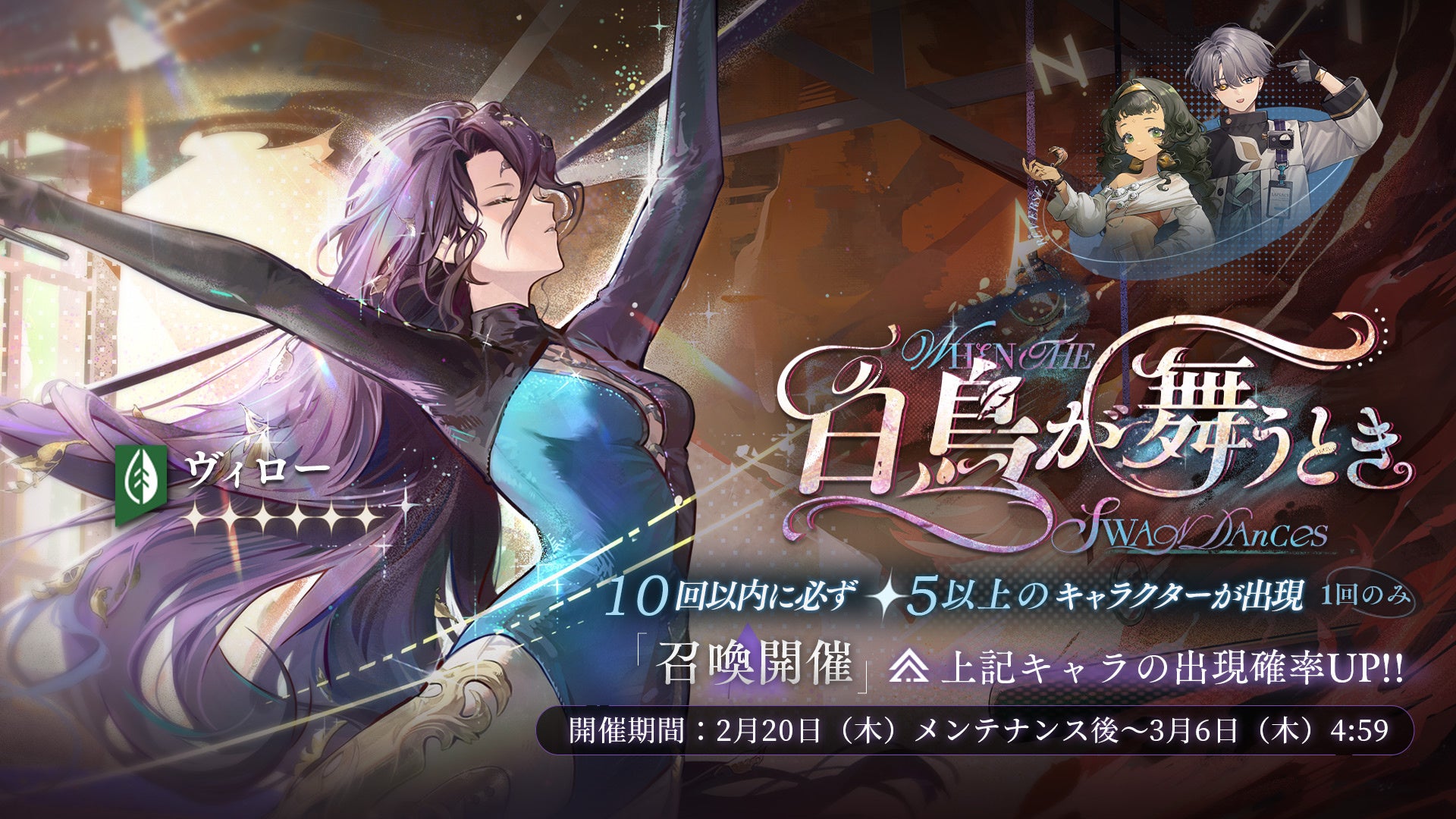 イベント「聖火紀行:イーストエンドの曙」にて物語の核となる人物「ヴィロー(CV.Lynn)」をピックアップした召喚イベント「白鳥が舞うとき」が開催中です。