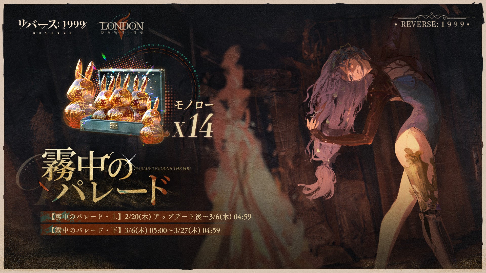 ログインイベント「霧中のパレード」では、3月6日を区切りに前半と後半でそれぞれモノローを7個ずつ獲得できます。獲得条件は各期間中に合計7日間ログインするだけなので、忘れずにログインしてお受け取りください。