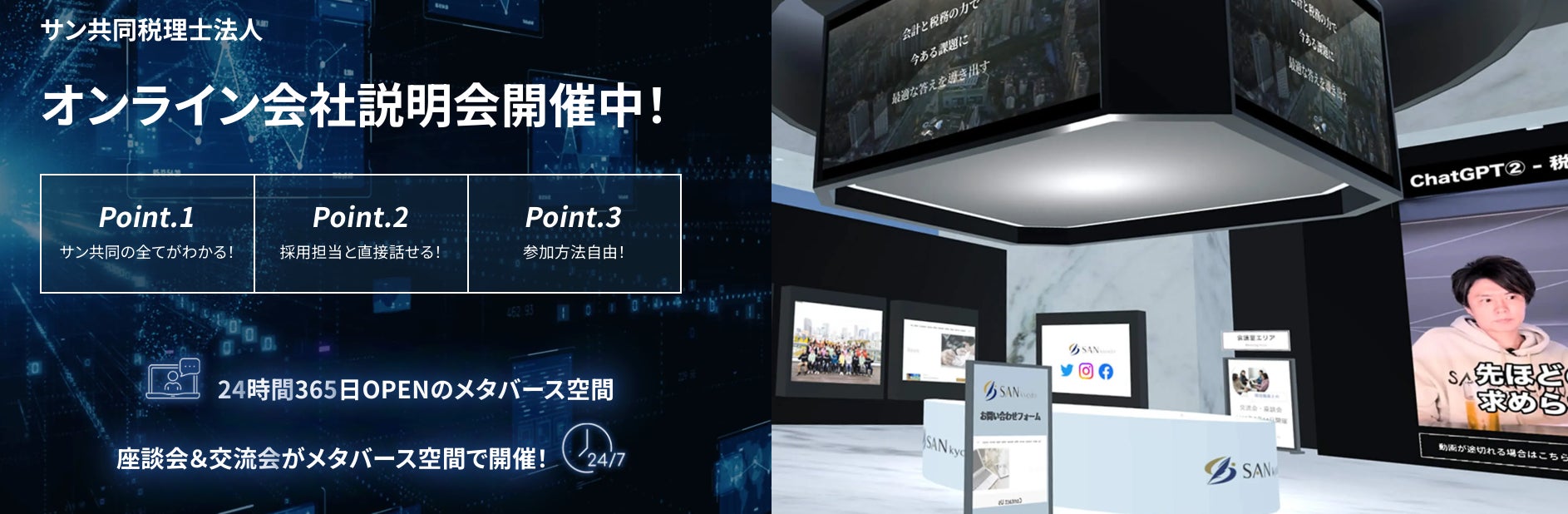 サン共同税理士法人(本社:東京都港区、代表社員: 朝倉 歩)は、2024年9月12日(木)19時30分よりオンライン会社説明会を開催いたします。