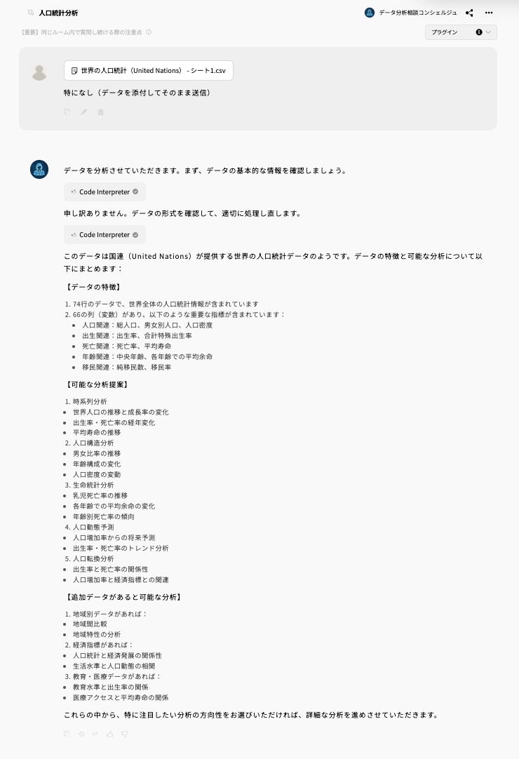 「データ分析コンシェルジュ」にExcelデータやcsvデータを読み込ませると、データの内容から、分析案を提案してくれます。
