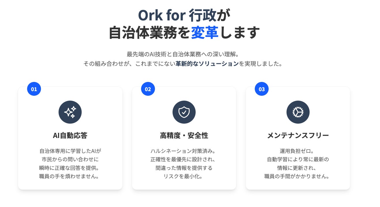 「Ork for 行政」は、データを事前に選定・整理する必要はありません。自治体ホームページのURLを登録するだけで、AIがサイト内の全情報を自動で読み込み(クローリング)、学習します。職員がQ&Aデータを作成したり、手動でチャットシナリオを作ったりするコストは一切かかりません。