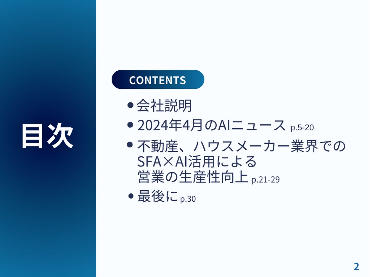 株式会社ベクトル(本社:東京都港区、代表取締役会長兼社長:西江 肇司、東証プライム:6058)の子会社であるOwned株式会社(東京都品川区、代表取締役社長、石井翔、以下「当社」)は、AIの最新トレンドをまとめた「不動産、ハウスメーカー業界向けSFA×AIによる営業の生産性向上」の資料の2024年5月版(全30ページ)を無料公開いたしました。