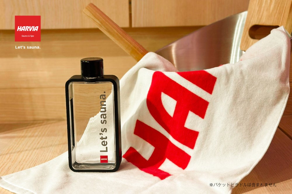 コラボに合わせて3月7日より、トントゥ抽選会に「ハルビア Let'sサ活セット」が登場!持ち運びしやすいコンパクトな水ボトル(非売品)と、赤いロゴが目を引くサウナタオルのセットです。