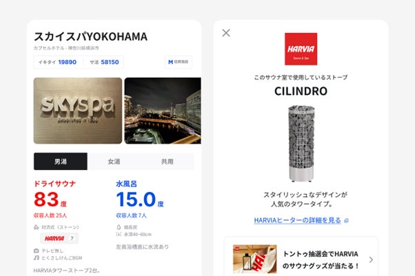 株式会社HARVIA JAPAN(本社:東京都港区、CEO 笠間聖司)は、株式会社サウナイキタイとタイアップし、サウナ検索サイト「サウナイキタイ」内で、当社製ヒーター等の導入施設検索が可能になったことをお知らせします。