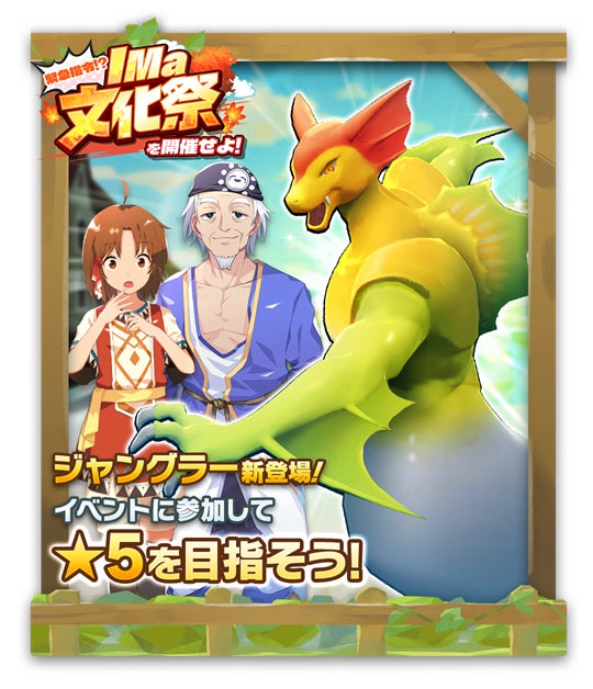 急遽IMaに集められたおなじみのメンバーたちがブラスの提案で文化祭を開催する期間限定のゲーム内イベント「緊急指令!? IMa文化祭を開催せよ!」では、モンスター育成完了時にもらえる「モンPt」が一定に達するごとに、「英雄の証」や「★3円盤石」、「ジャングラーのハート」と「ジャングラーメダル」などの豪華報酬がもらえます。「ジャングラーメダル」は、交換所で「ジャングラー円盤石」などと交換が可能です。