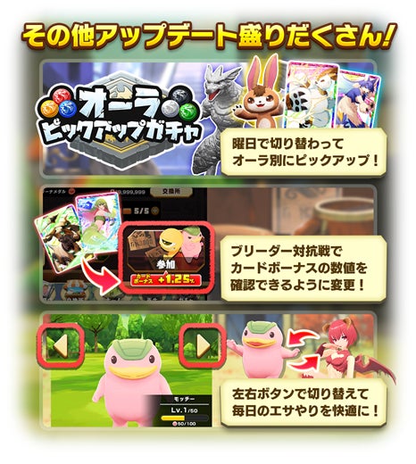 所持するモンスターの「絆レベル」、「才能レベル」、「潜在能力レベル」をポイント化し、そのポイントを支払い「書」に記されたさまざまな効果を解放していく新育成システムが登場します。「書」は、すべてのモンスターに効果を与える「基本の書」や、特定オーラモンスターのみに効果を与える「オーラの書」が存在し、初期ステータスUPや、育成中のみステータスUPなど、育成モンスターに好影響を与える効果を多数用意しています。また、「書」の効果を解放するほど、育成時に高難度の大会を勝ちやすくなり、結果として高い総合力を持つモンスターを育てやすくなります。「絆レベル」、「才能レベル」、在能力レベル」のうち、「絆レベル」、「才能レベル」は、毎日短い時間のプレイでも積み重ねることができます。どのモンスターを育ててもポイントが手に入りますので、さまざまなモンスターを育成して「育成の書」を完成させましょう。
