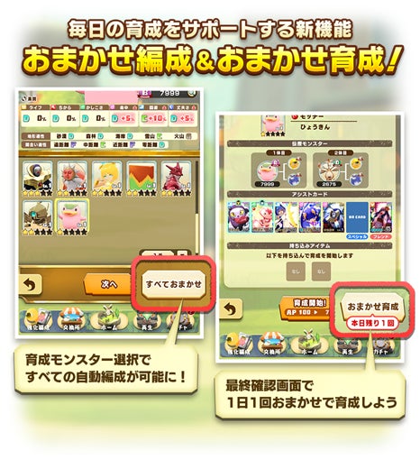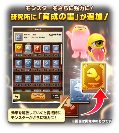1日1回まで、即座にモンスターを育成完了することができる機能「育成スキップ」を追加予定です。この機能により手軽にマスモン(マスターモンスター)を手に入れることができるため育成イベントに参加しやすくなるほか、「育成の書」でポイントを得るための絆レベル上げにも役立ちます。