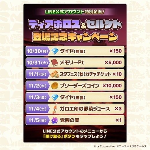 新モンスター「ディアボロス」、「セルケト」の登場を記念して、対象期間中にLINE公式アカウント(LINE ID: @line_monsterfarm)のリッチメニューをタップすると日替わりでアイテムがもらえるキャンペーンを実施します。