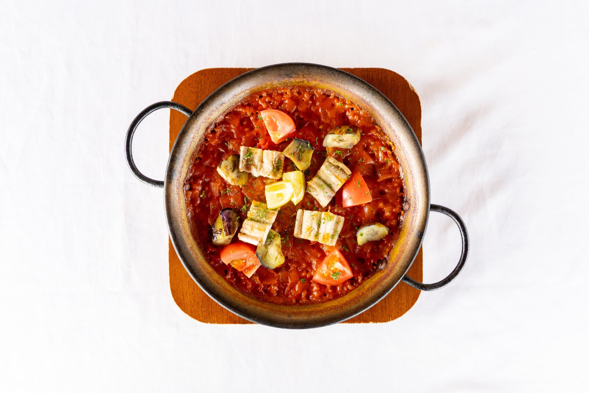 ふっくら焼き上げた穴子の香ばしさ、茄子のとろみ、トマトの酸味。