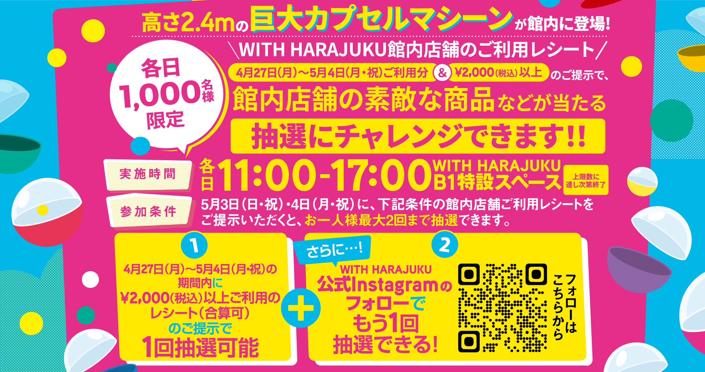 【参加方法1】 2026年5月3日(日・祝)・4日(月・祝)に、下記条件の館内店舗ご利用レシートをご提示いただくと、お一人様最大2回まで抽選できます。 2026年4月27日(月)~5月4日(月・祝)の期間内の2,000円(税込)以上ご利用のレシート(合算可)のご提示で1回抽選可能 【参加方法2】 さらに、WITH HARAJUKU 公式Instagramのフォローでもう1回抽選できる! 公式Instagram:https://www.instagram.com/withharajuku/ |