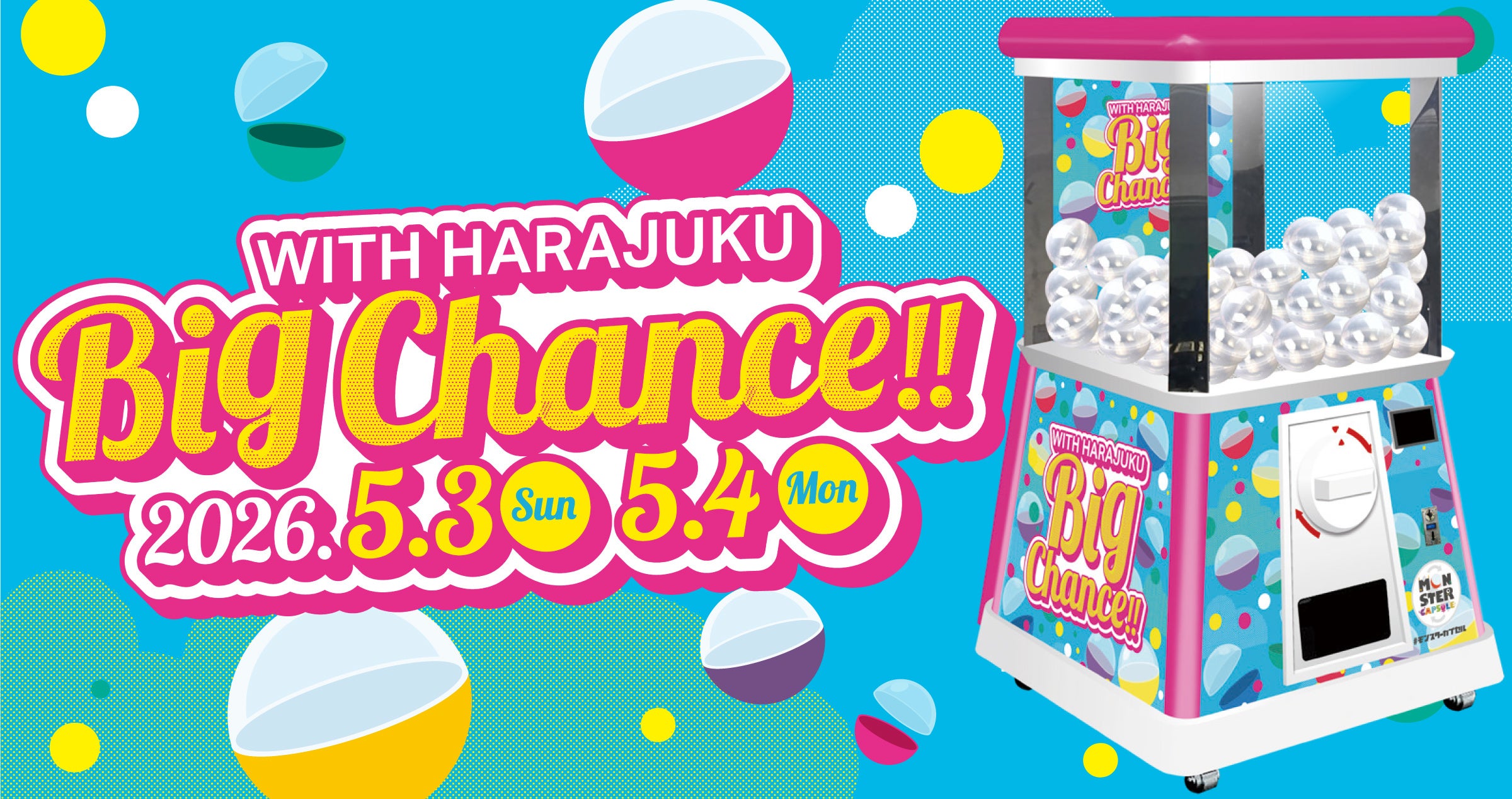 巨大ガチャ「モンスターカプセル」の企画・運営を行う株式会社グリーグローブ(本社:東京都文京区/代表取締役:上村 正治)は、2026年5月3日(日・祝) ・4日(月・祝)2日間、WITH HARAJUKU B1特設スペースにて開催される『WITH HARAJUKU BIG CHANCE!!』に高さ2.4mの巨大ガチャ「モンスターカプセル」機材を提供します。