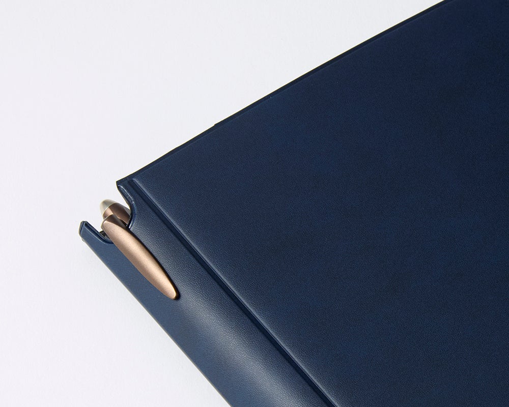 最大2冊までノートを差し込めるポケットを備えており、用途に応じてノートを使い分けることができます。内側にはカードポケットとフリーポケットがあり、名刺や書類などの紙類をすっきりと収納可能。さらに、スリットタイプのペンホルダーを採用しており、ペンをスマートに収めることができます。