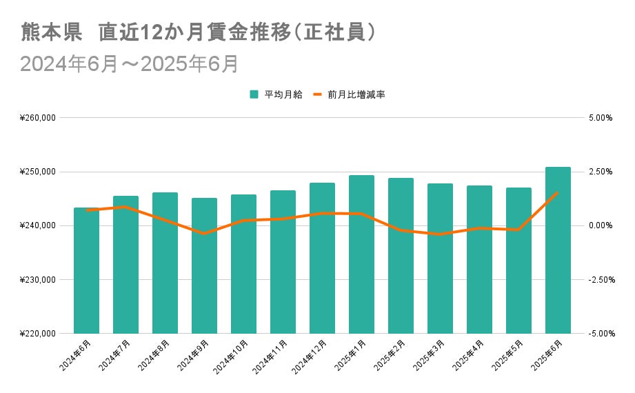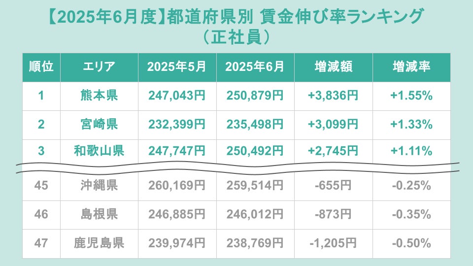 正社員の都道府県別賃金伸び率ランキング(前月比)トップ3は、1位が熊本県(増加額+3,836円、増加率+1.55%)、2位が宮崎県(増加額+3,099円、増加率+1.33%)、3位が和歌山県(増加額+2,745円、増加率+1.11%)でした。