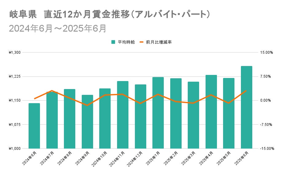 1位の岐阜県と47位の茨城県における直近12か月の賃金推移を比較すると、岐阜県の平均賃金は月ごとの変動を挟みながらも上昇を続け、2025年5月から同年6月にかけては複数の企業が塾講師募集の高時給案件を出稿したことにより、前月比+3.11%と大きく上昇しました。