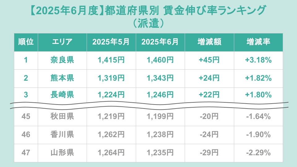 求人サイト主要9媒体から雇用形態別に分析!派遣では奈良県が前月比+3.18%で1位【2025年6月度 都道府県別 賃金伸び率ランキング】