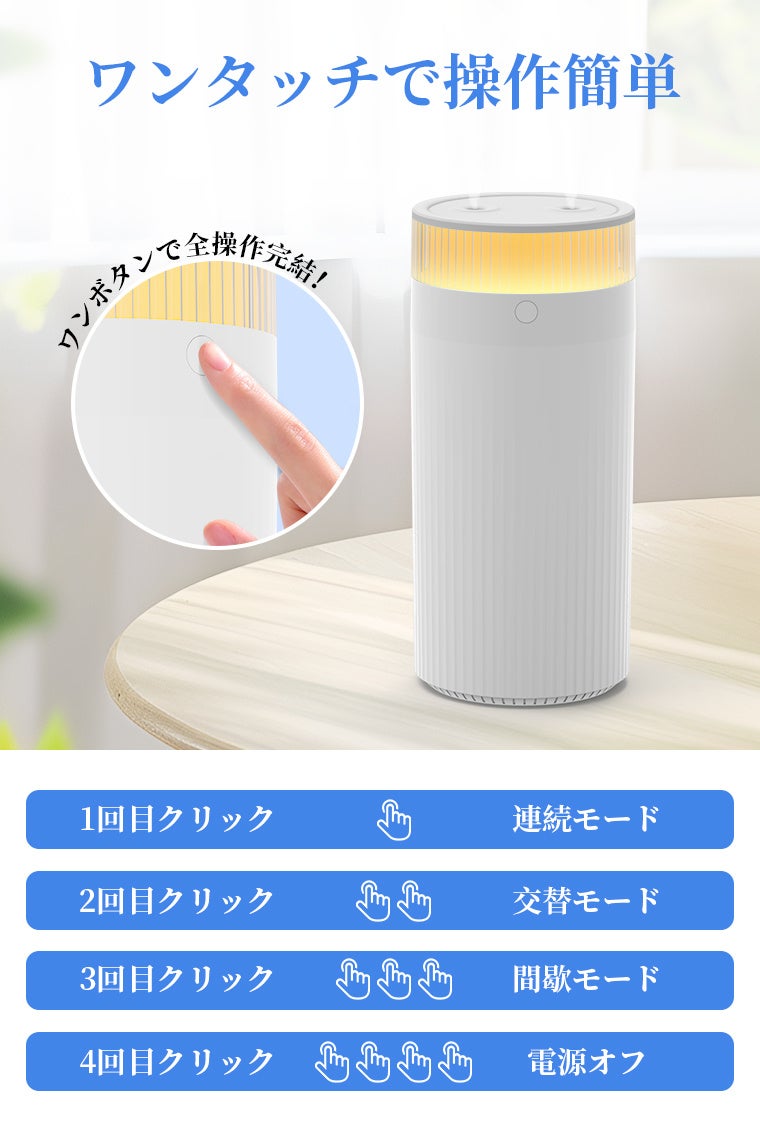 機能:二重除菌、アロマ対応、3段階噴霧、静音設計、自動オフ