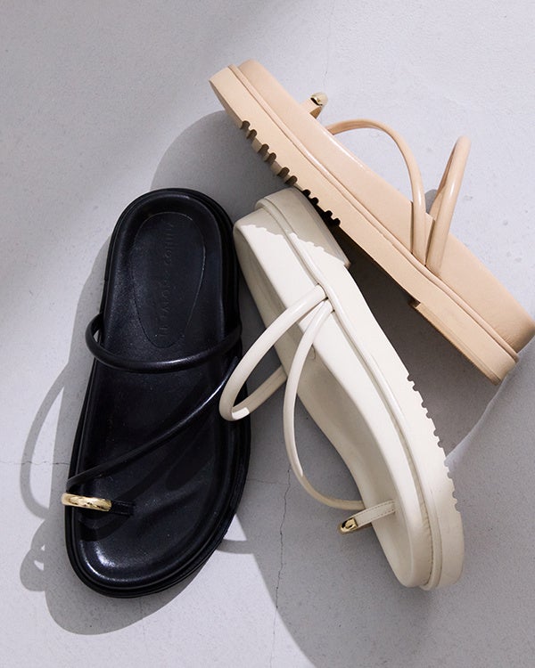 サムリングにあしらったメタルディテールが足元にさりげないきらめきをプラスし、シンプルな装いのアクセントに。返りの良いソールと足をホールドするストラップ設計で、歩きやすさと安定感を両立しています。また、程よい厚底ソールにより、小柄女性が求める自然なスタイルアップを叶え、全身バランスを整えます。