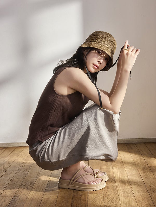 小柄女性向け「COHINA」×「LE TALON」コラボ。休井美郷をモデルに迎え、初の“厚底メタルサムリングサンダル”が登場