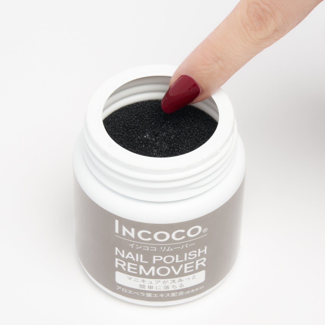 「インココリムーバー」は、ボトル内のスポンジに指を入れて使うタイプの除光液。スポンジに爪を押し当ててクルクルと回すだけで、落ちにくいラメも簡単にスッキリとオフ。コットンなどのゴミも出ず、時間をかけて何度も爪を拭き取る煩わしさからも一気に解放されます。