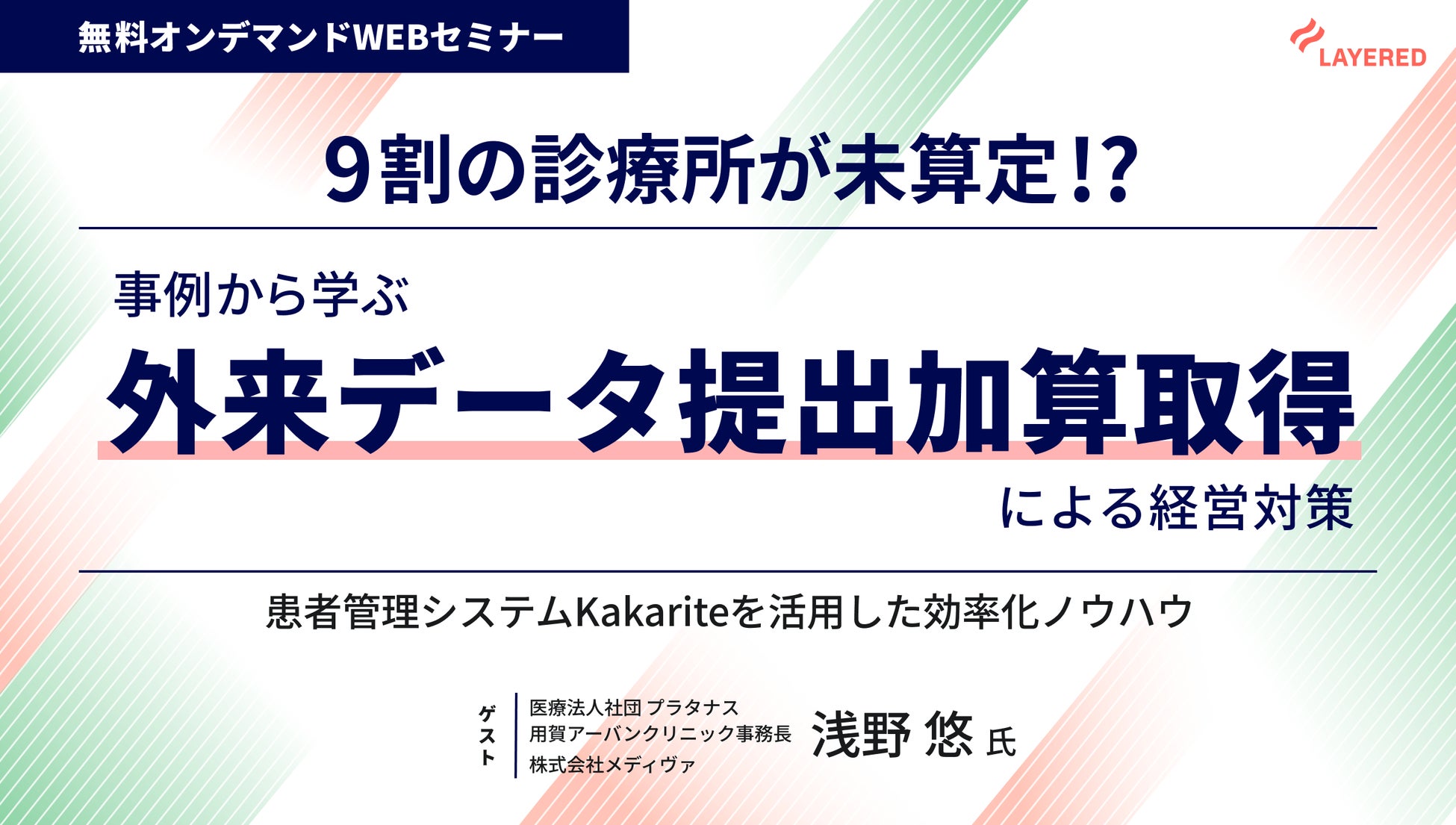 本取り組みに関連し、株式会社メディヴァ/用賀アーバンクリニック事務長の浅野悠氏を講師にお迎えし、外来データ提出加算の算定事例をご紹介するウェビナーを開催いたします。