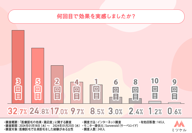 「何回目で効果を実感しましたか?」と質問したところ「3回目(32.7%)」「5回目(24.8%)」「2回目(17%)」と続きました。
