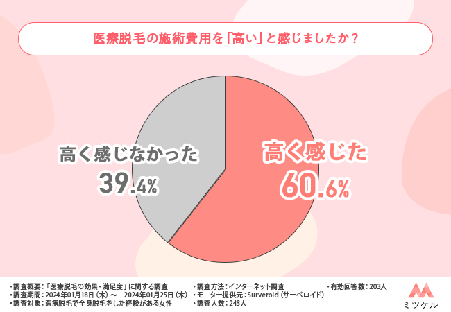 調査した結果、「医療脱毛の施術費用は高く感じたが脱毛効果には満足している」という方が多いことが分かりました。
