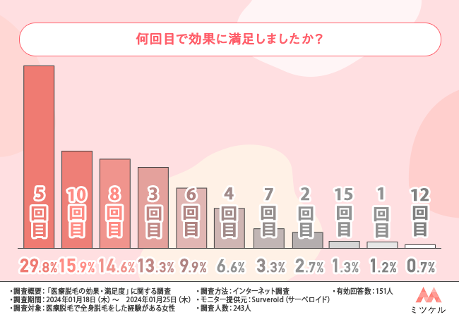 「何回目で効果に満足しましたか?」と質問したところ「5回目(29.8%)」「10回目(15.9%)」「8回目(14.6%)」と続きました。