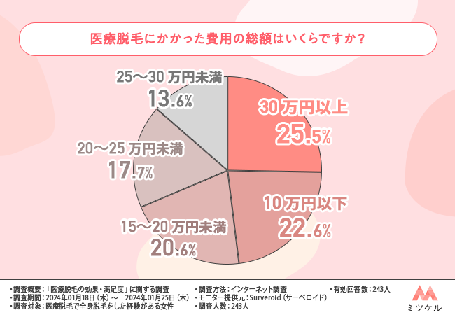 「医療脱毛にかかった費用の総額はいくらですか?」と質問したところ「30万円以上(25.5%)」「10万円以下(22.6%)」「15万円〜20万円未満(20.6%)」と続きました。