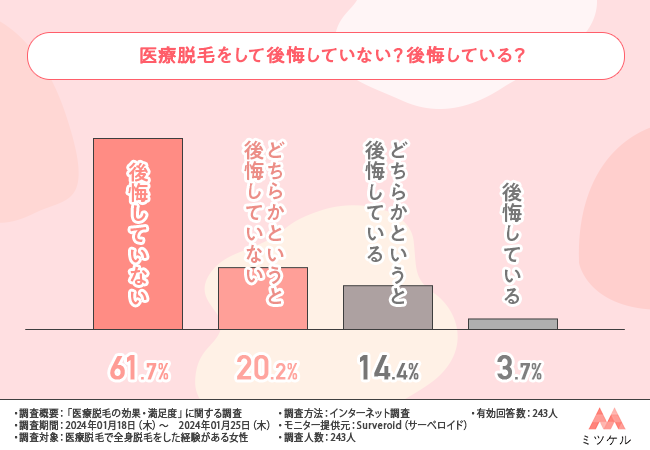 はじめに「医療脱毛をして後悔していない?後悔している?」と質問したところ、「後悔していない(61.7%)」という回答が最も多く「どちらかというと後悔していない(20.2%)」「どちらかというと後悔している(14.4%)」「後悔している(3.7%)」と続きました。