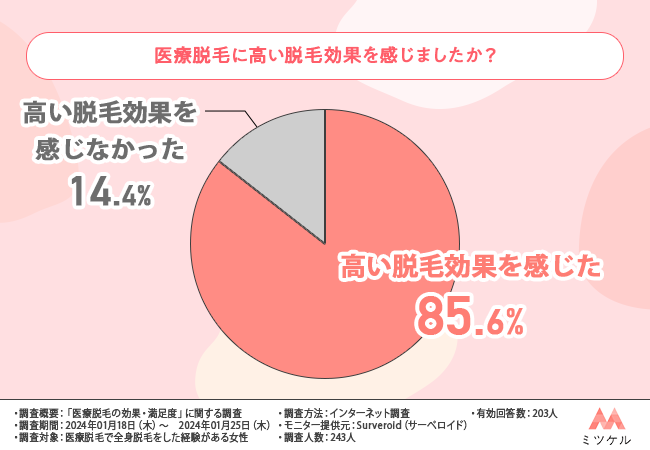 「医療脱毛に高い脱毛効果を感じましたか?」と質問したところ「高い脱毛効果を感じた(85.6%)」「高い脱毛効果を感じなかった(14.4%)」という結果になりました。