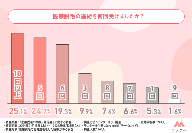 「医療脱毛の施術を何回受けましたか?」と質問したところ「10回以上(25.1%)」「5回(24.7%)」「6回(19.3%)」と続きました。