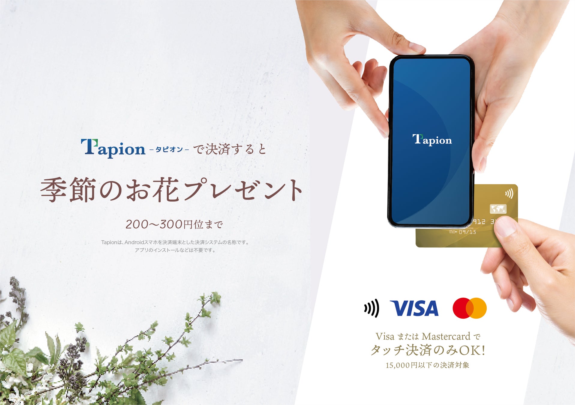 Tapionパイロット運用中は、TapionアプリのPOS機能を使った「Tapionプラチナバージョン」を活用しタッチ決済を行なっています。具体的には、事前に「切り花・ブーケ・小物販売」など多岐にわかる商品をTapion加盟店ポータルサイト上で商品登録・変更を行い、各カテゴリーに分類することで、Androidの操作性はそのままに、お会計時にスムーズに処理をすることが可能です。また、Tapion加盟店ポータルサイト上で行った変更は、その場でAndorid端末のTapionアプリで確認することができ、常に最新の登録内容でPOS機能を利用することが可能です。更にパイロット第二弾では、Tapionアプリから「レシート」「領収書」を選択し、レシートプリンターによるレシート/領収書印刷にも対応しています。