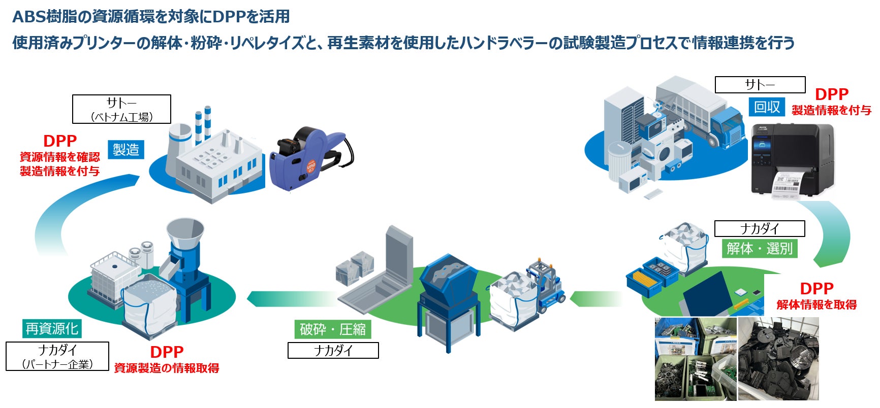 本PoCでは、サトー製のラベルプリンターを対象に、廃棄のための回収から解体・破砕、再生素材の製造、再生素材によるハンドラベラーの試験製造に至るプロセスを用い、DPPの社会実装に資する具体的なモデルケースを検証します。