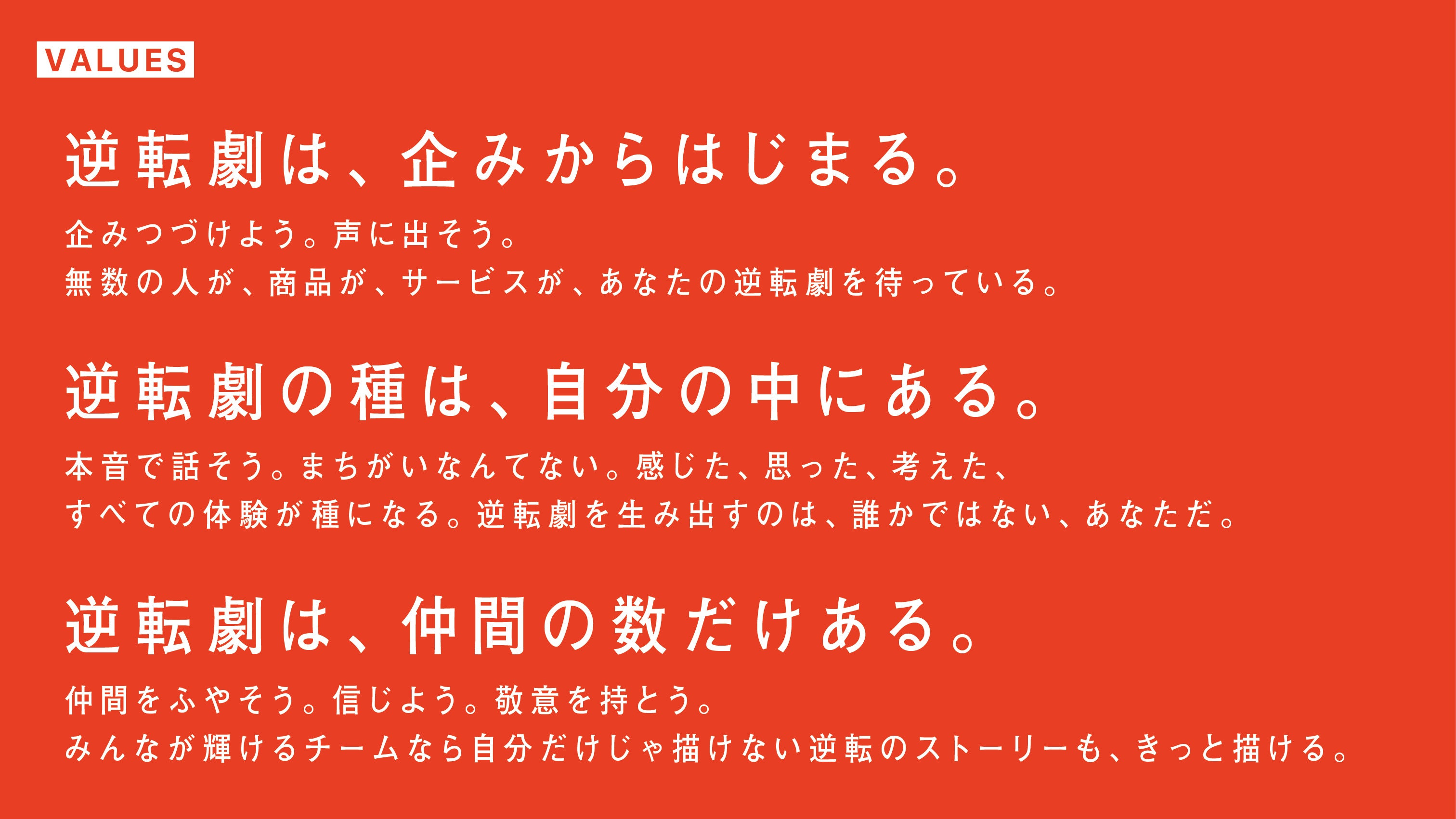 私たちには、裂古破今(れっこはこん:古きを裂き、今さえも破る)という創業当時から受け継がれるDNAがあります。生活者と深くつながり、「価値創造」に成功した組織やサービスだけが成長を続けられる時代だからこそ、600人のゲームチェンジャーが、時代に翻弄されることなく、それぞれの個性や本質を捉え、ともに新たな価値を創出し、変革へ伴走できるパートナーとして、皆様とともに目指すべき「次」へ挑戦していきます。